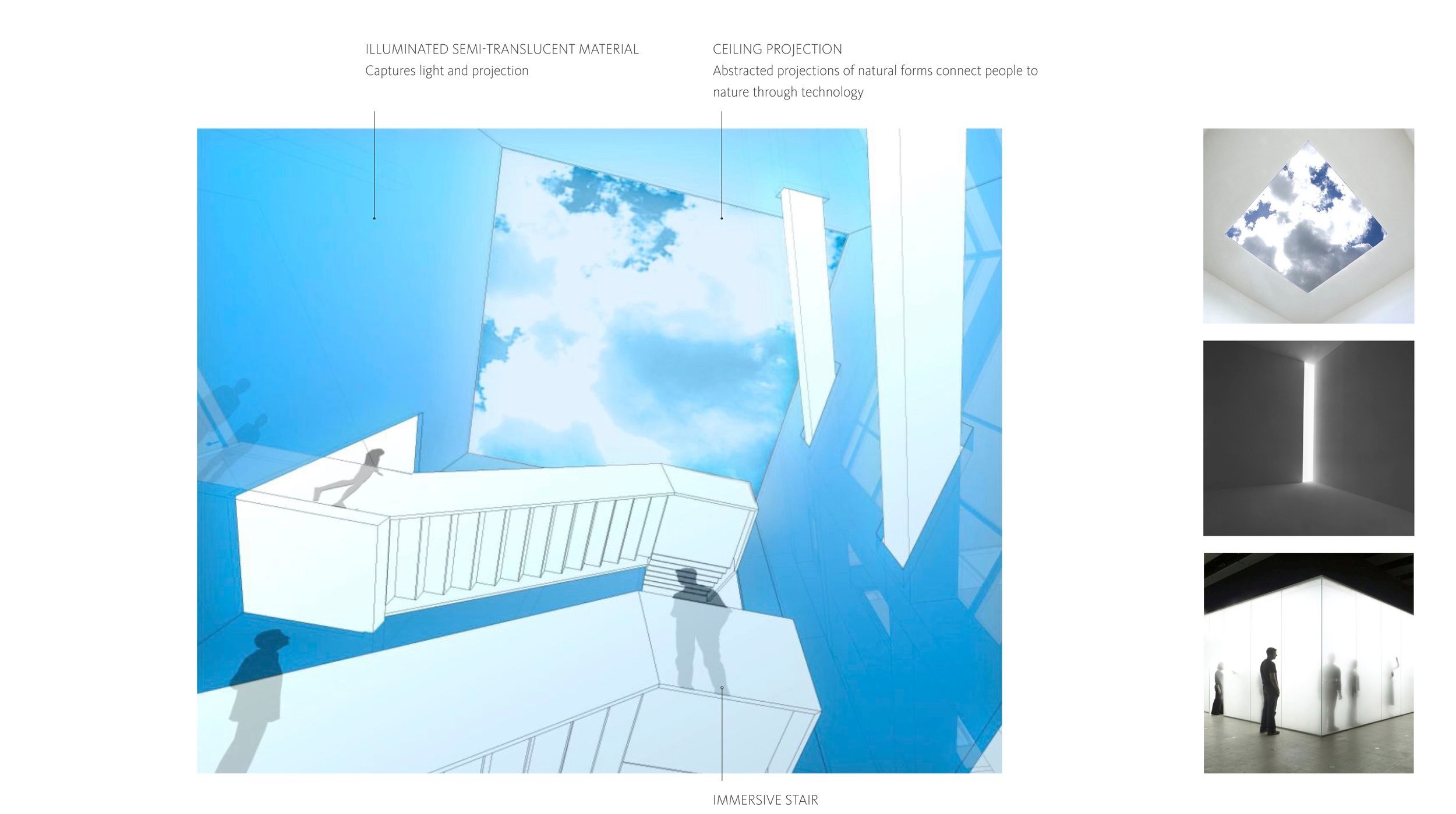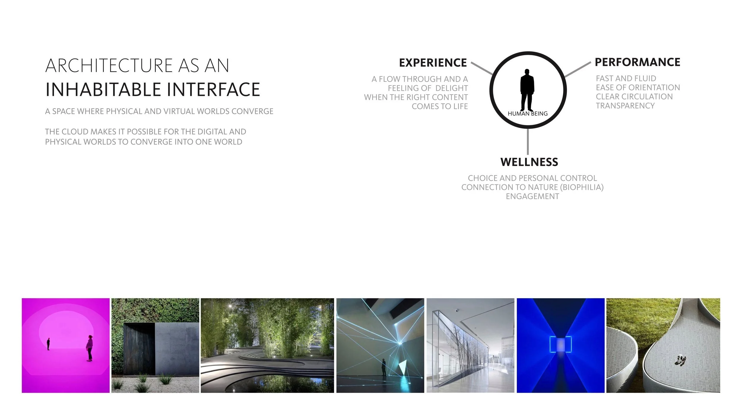 A unique feature in each lobby is a two-story suspended cube, equipped with motion-sensing Microsoft Kinect, creating an interactive environment where employees engage with content displayed on a 34-foot-high video wall.