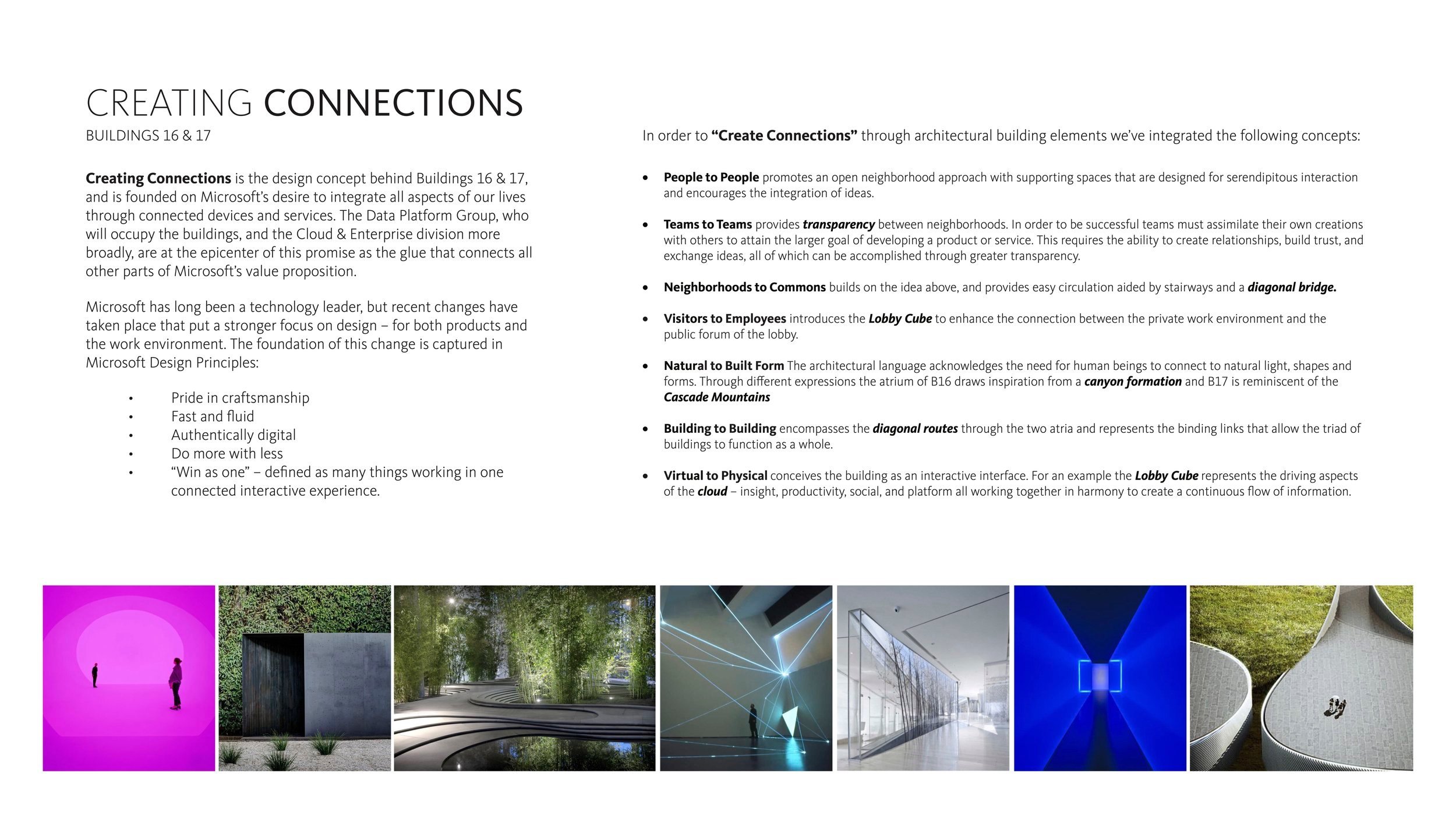 The design concept for this workspace environment is "Creating Connections," spanning two separate buildings: Building 16 & Building 17. It mirrors Microsoft's overarching goal of integrating all facets of people's lives through interconnected devices and services. The workspace is thoughtfully designed to encourage various forms of connection and collaboration. People gather and connect through "Scrum" meetings in open neighborhoods, teams collaborate between neighborhoods, and individuals interact within common areas, which serve as social hubs for relaxation and informal meetings. In addition, game rooms and wellness rooms provide spaces for refreshment and rejuvenation.