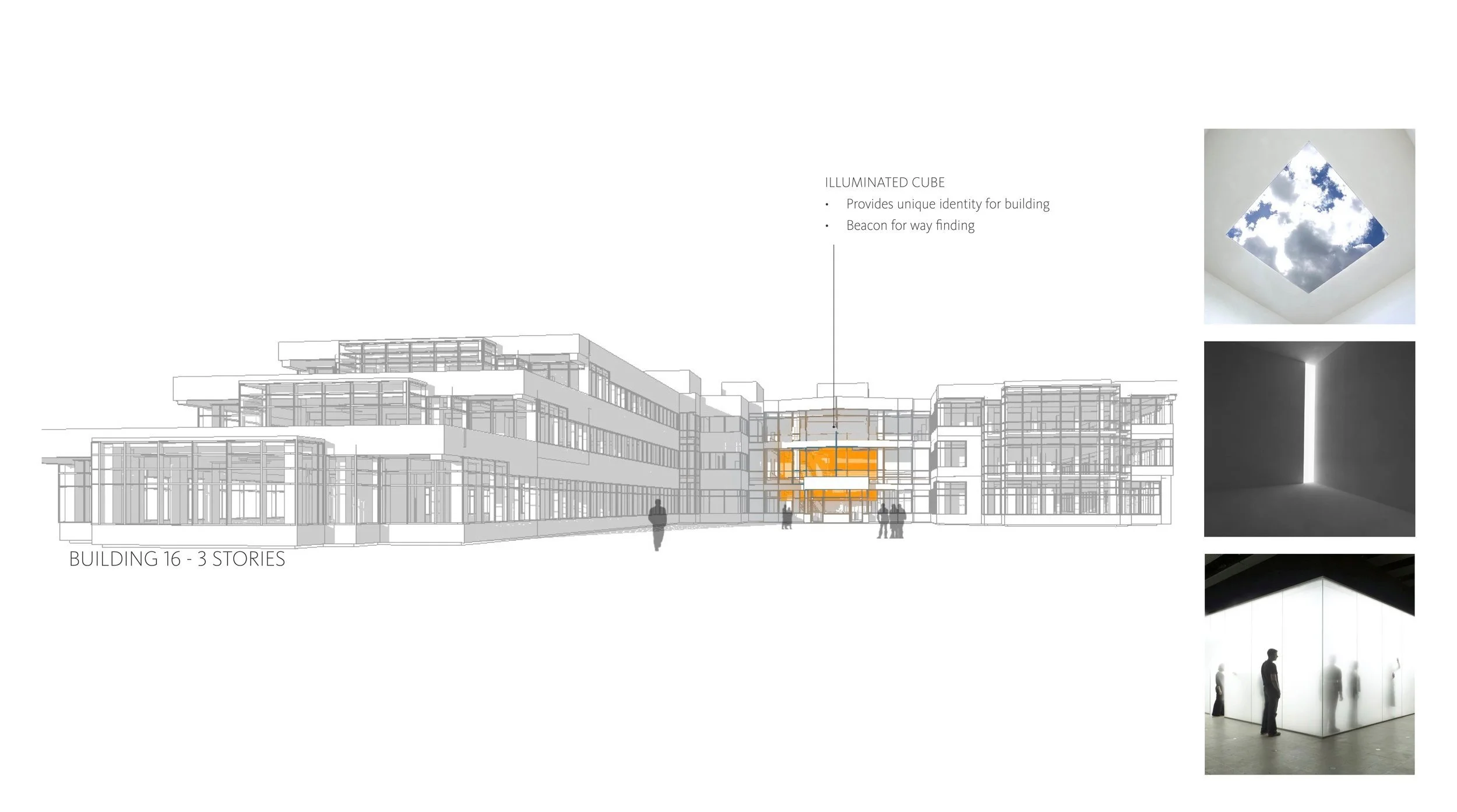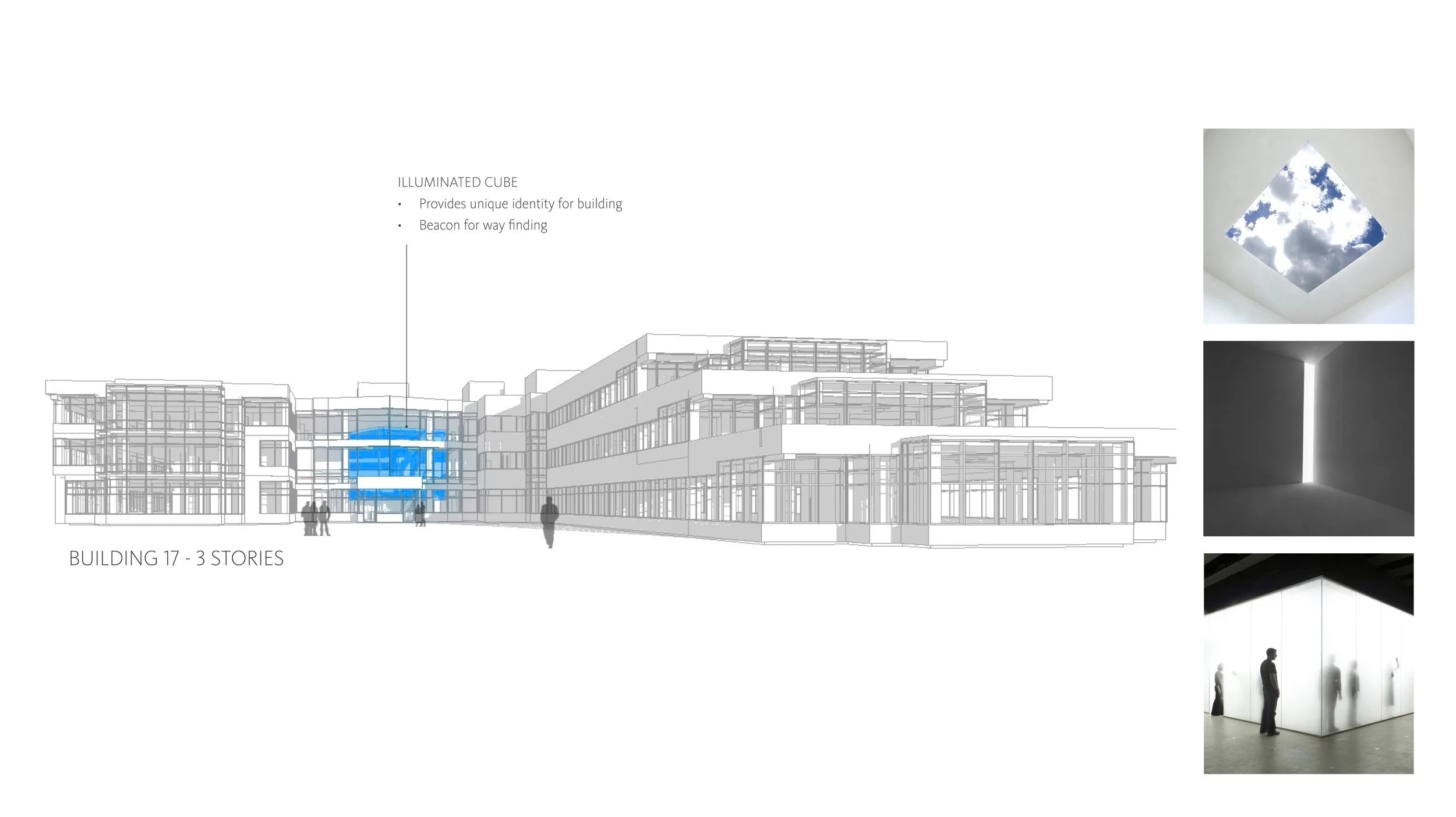 The architectural design takes inspiration from the human need to connect with natural elements. Building 16's atrium is influenced by canyon formations, while Building 17 draws inspiration from rock landscapes.